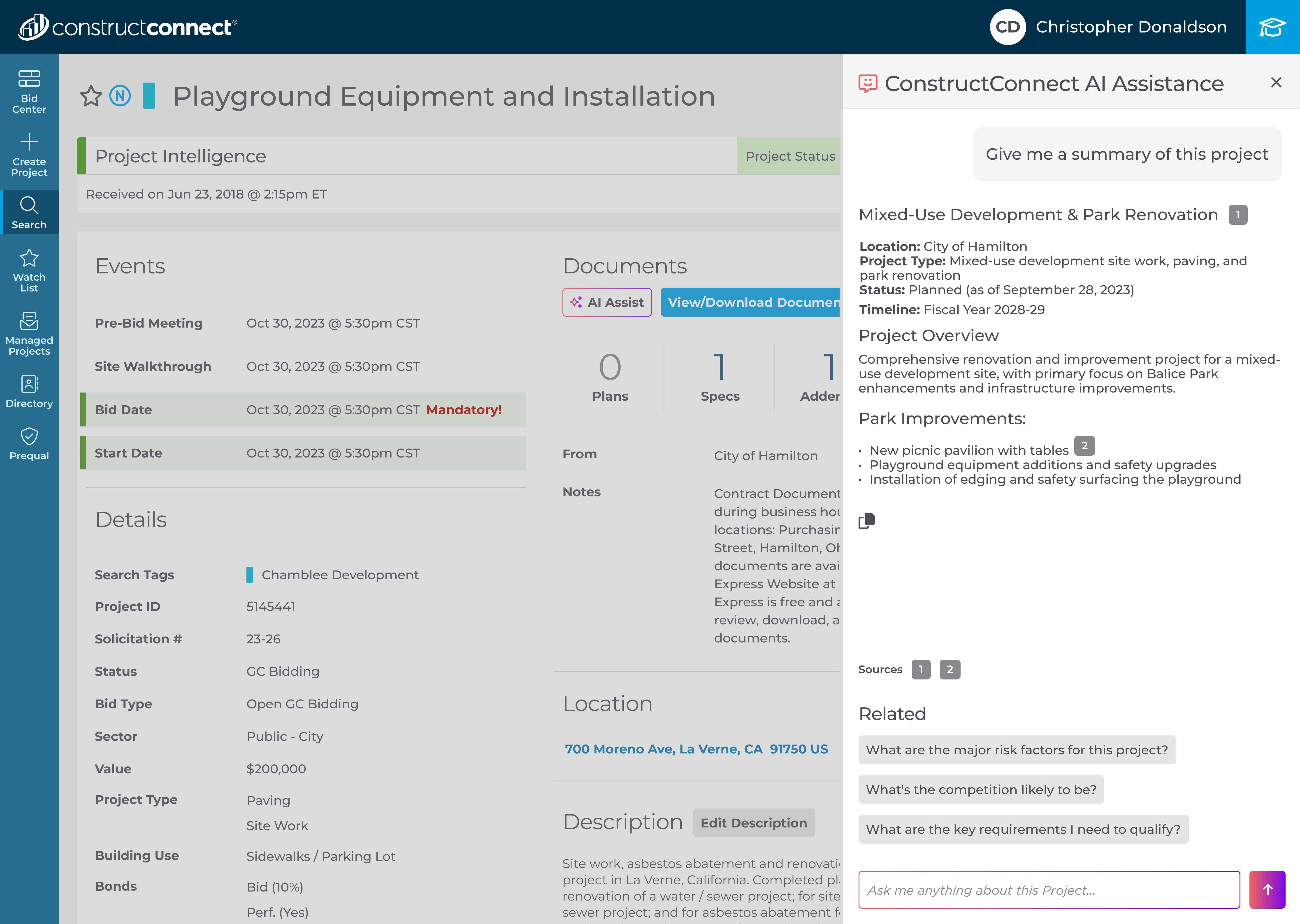 Our AI-powered solution is integrated into the Project Detail Pages for workflow integration. By allowing users to ask questions in natural language, the chatbot provides fast, accurate responses that are directly sourced from the projects documents. This not only saves time but also enhances decision-making by ensuring that contractors have access to the most relevant information without the need for manual document review.