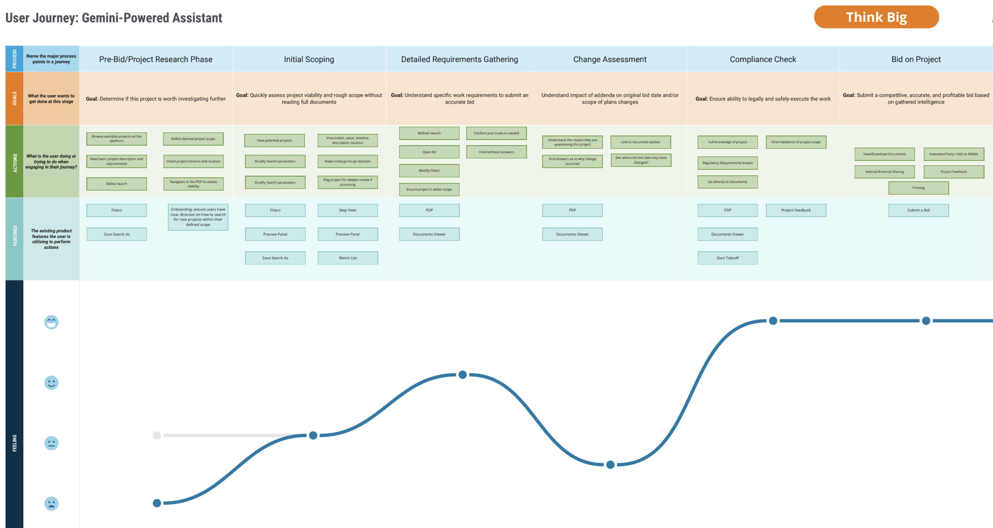 The user journey map was instrumental in shaping both the interface design and the AI training requirements. It also helped validate task flows with stakeholders before committing to high-fidelity designs. This map outlines the journey of our primary personas, General Contractors, as they search for new projects to bid on and review necessary documents before submitting their bids.