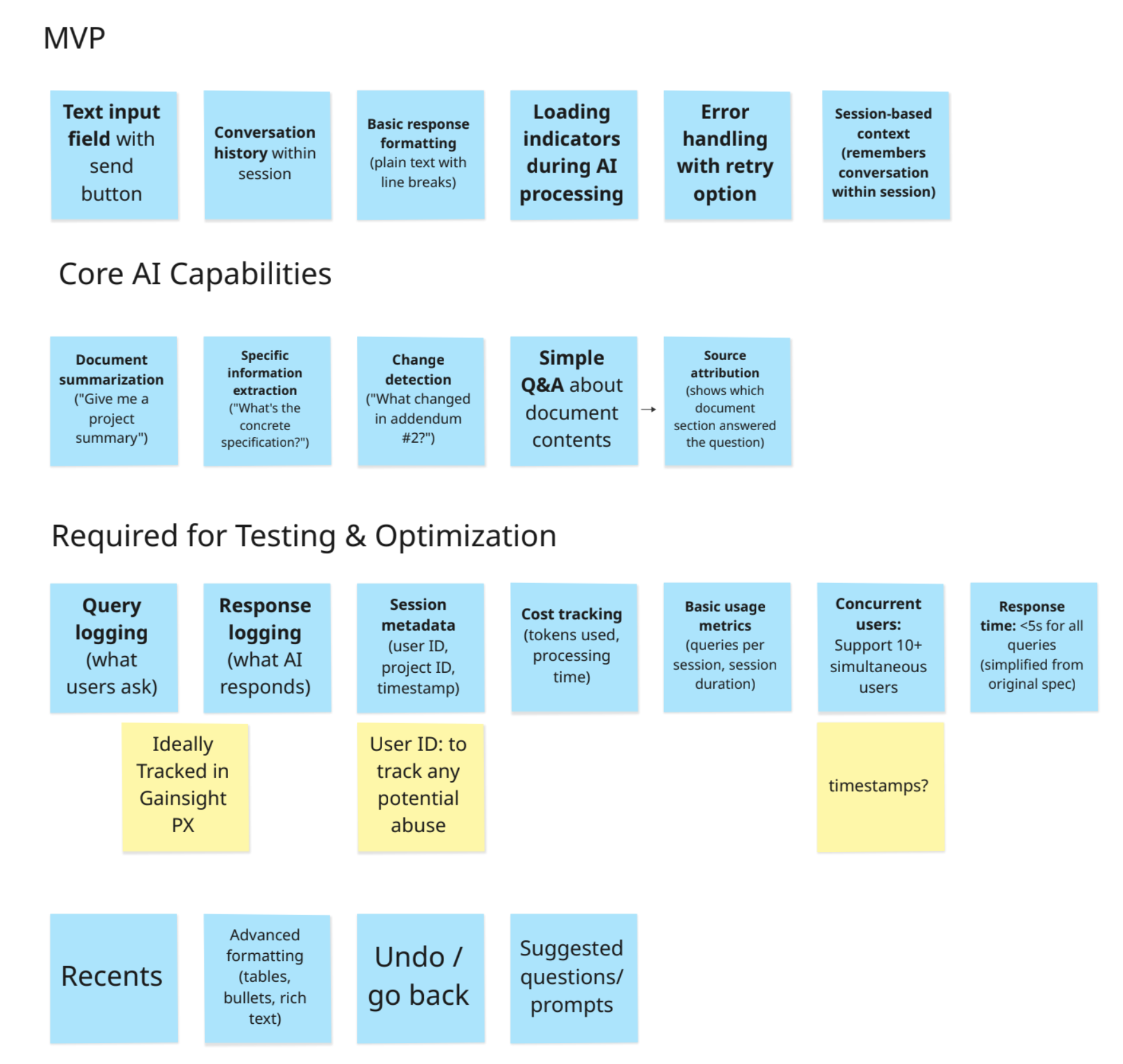 I compiled a comprehensive list of our MVP components and documented the core AI capabilities for team reference. I participated in complex architecture and backend discussions, which also required visual aids unbeknownst to others. I was involved in high-level discussions about technical feasibility from the outset. Additionally, I considered testing and quality engineering requirements, as I collaborate closely with engineers and QE professionals on a daily basis.