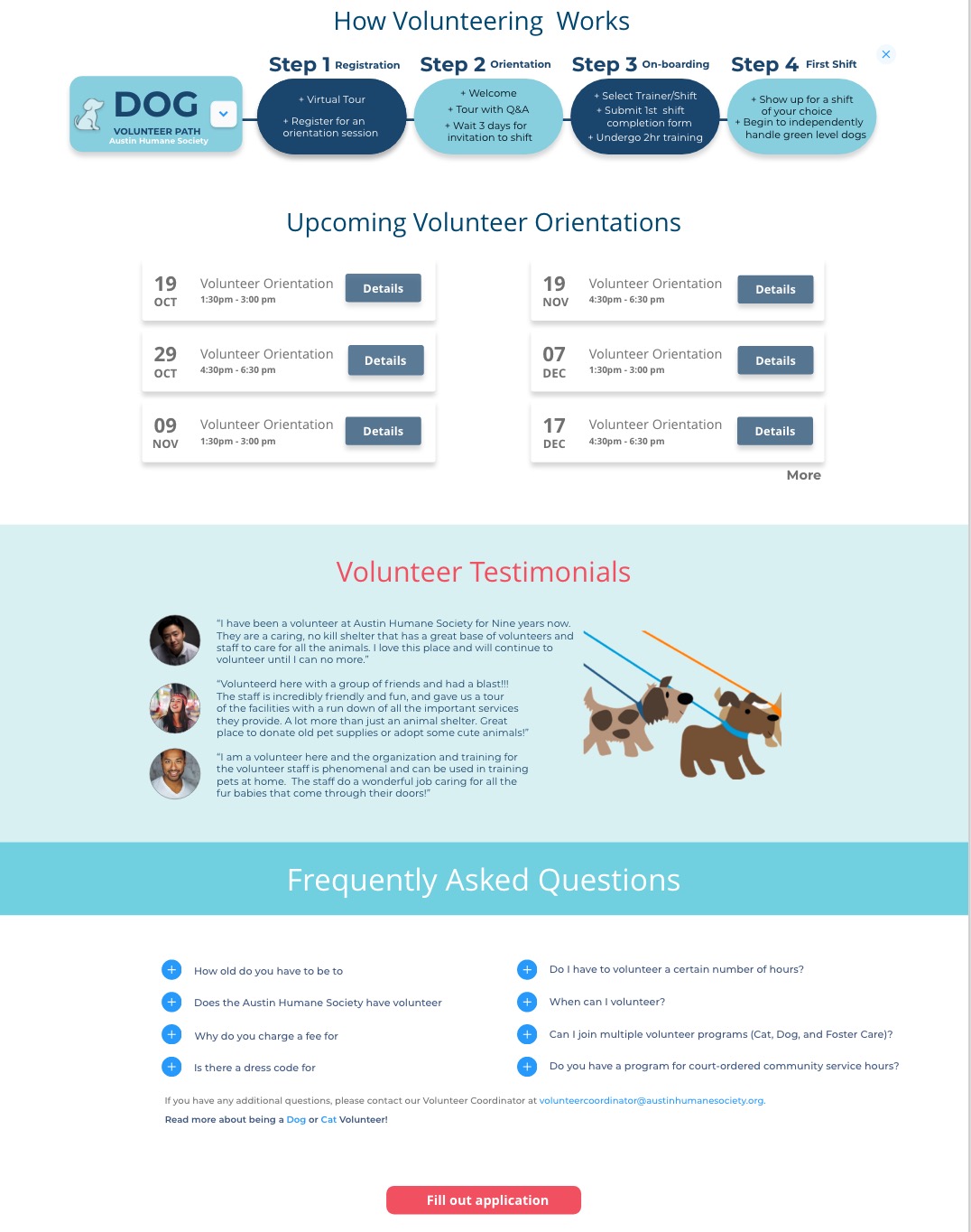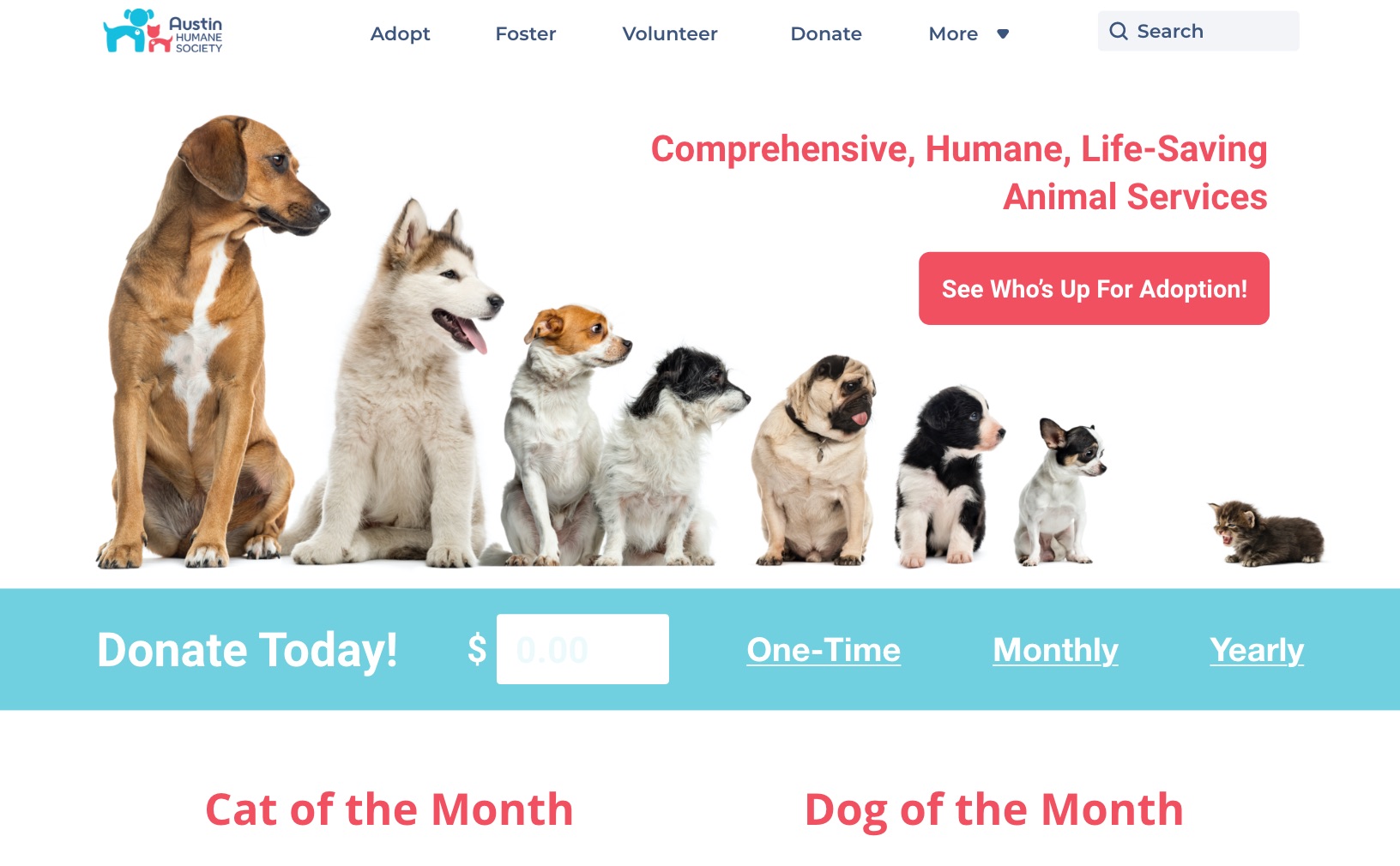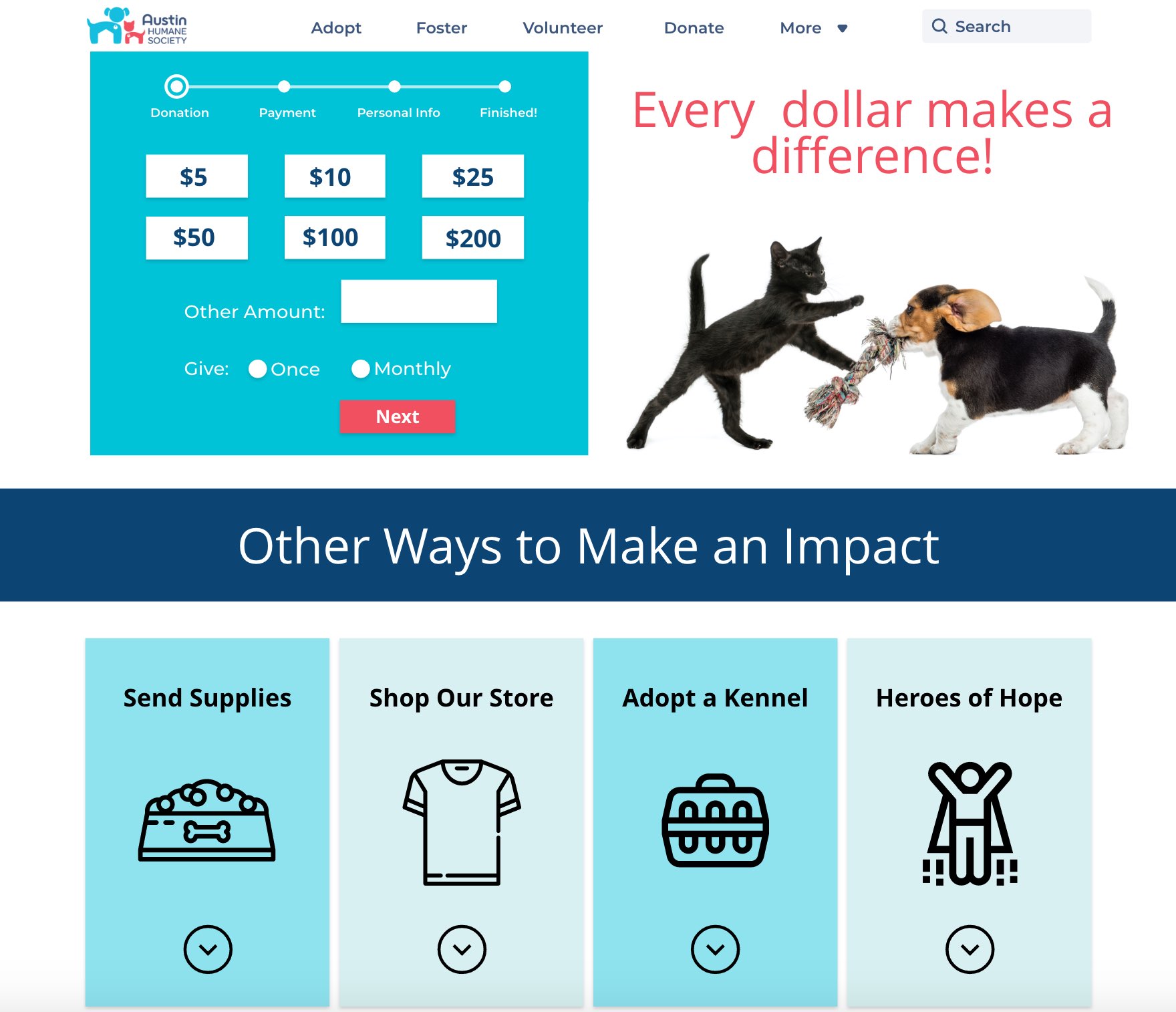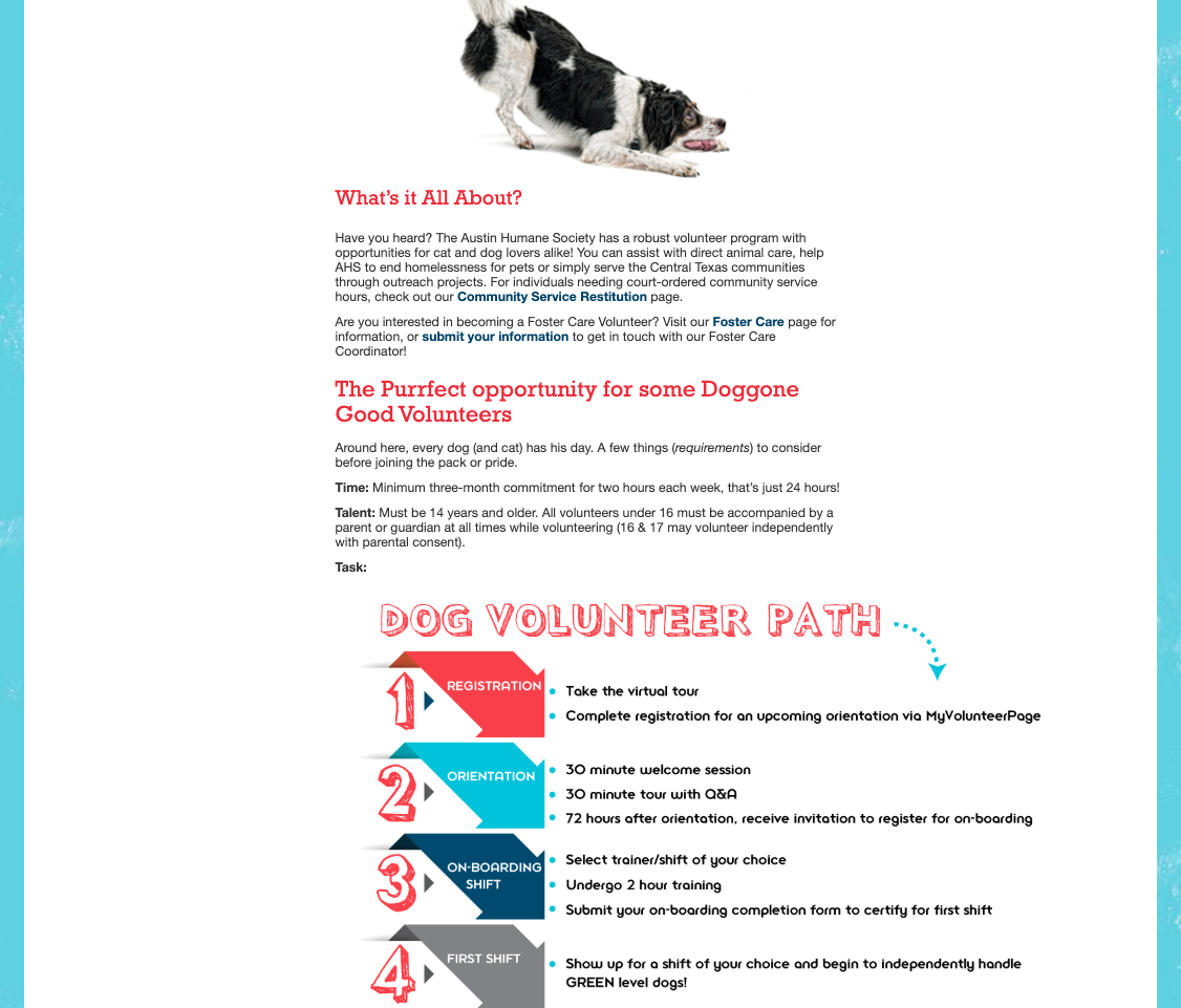 For Austinites to be encouraged to foster, adopt and donate to Austin Humane Society (referred to as AHS), they need to feel a connection to the organization and accomplish navigation on the website to find the information they need easily.