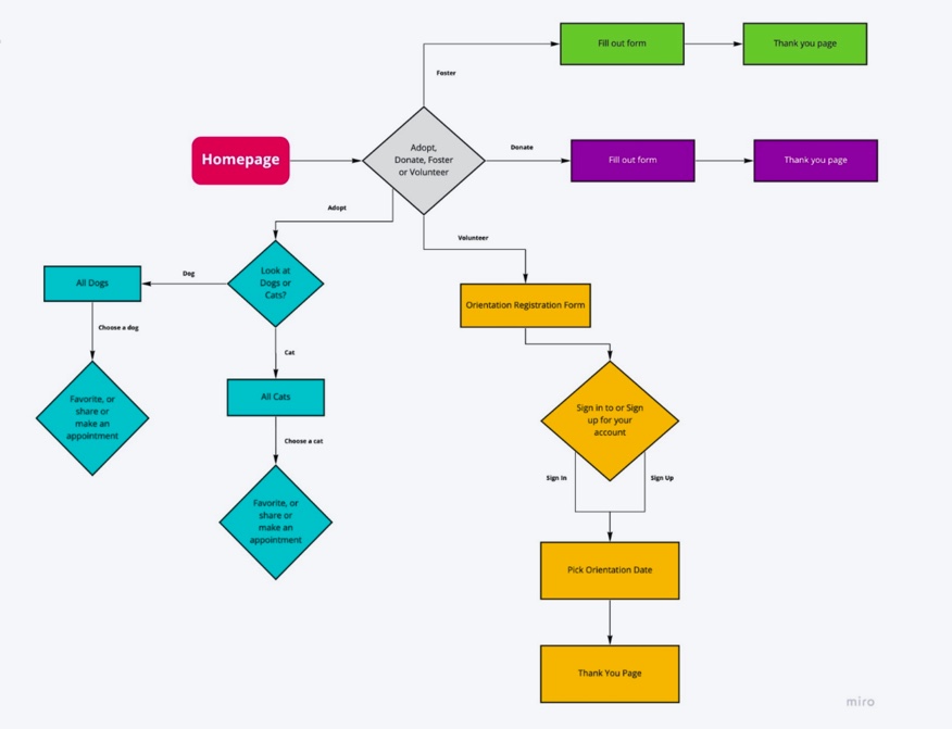 From the results of the survey, to our early interviews with potential users, we were guided into making informed decisions for our design process. We discovered that the majority of animals owners in Austin adopted their pets and found them online. These exciting results helped guide us towards these four pages as our focal points.