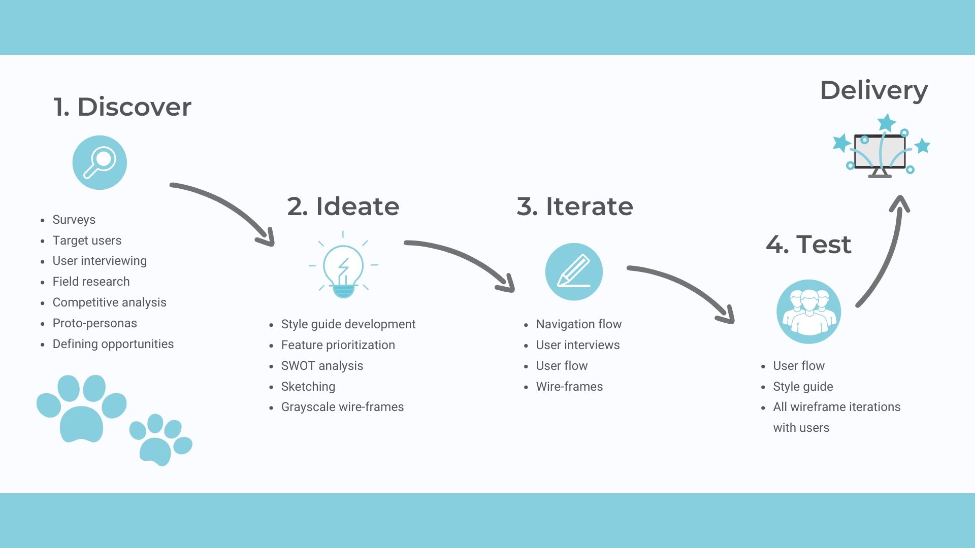 I broke our research plan down into 4 categories to help us stay organized and set ourselves up for a successful delivery of the redesigned website and application.