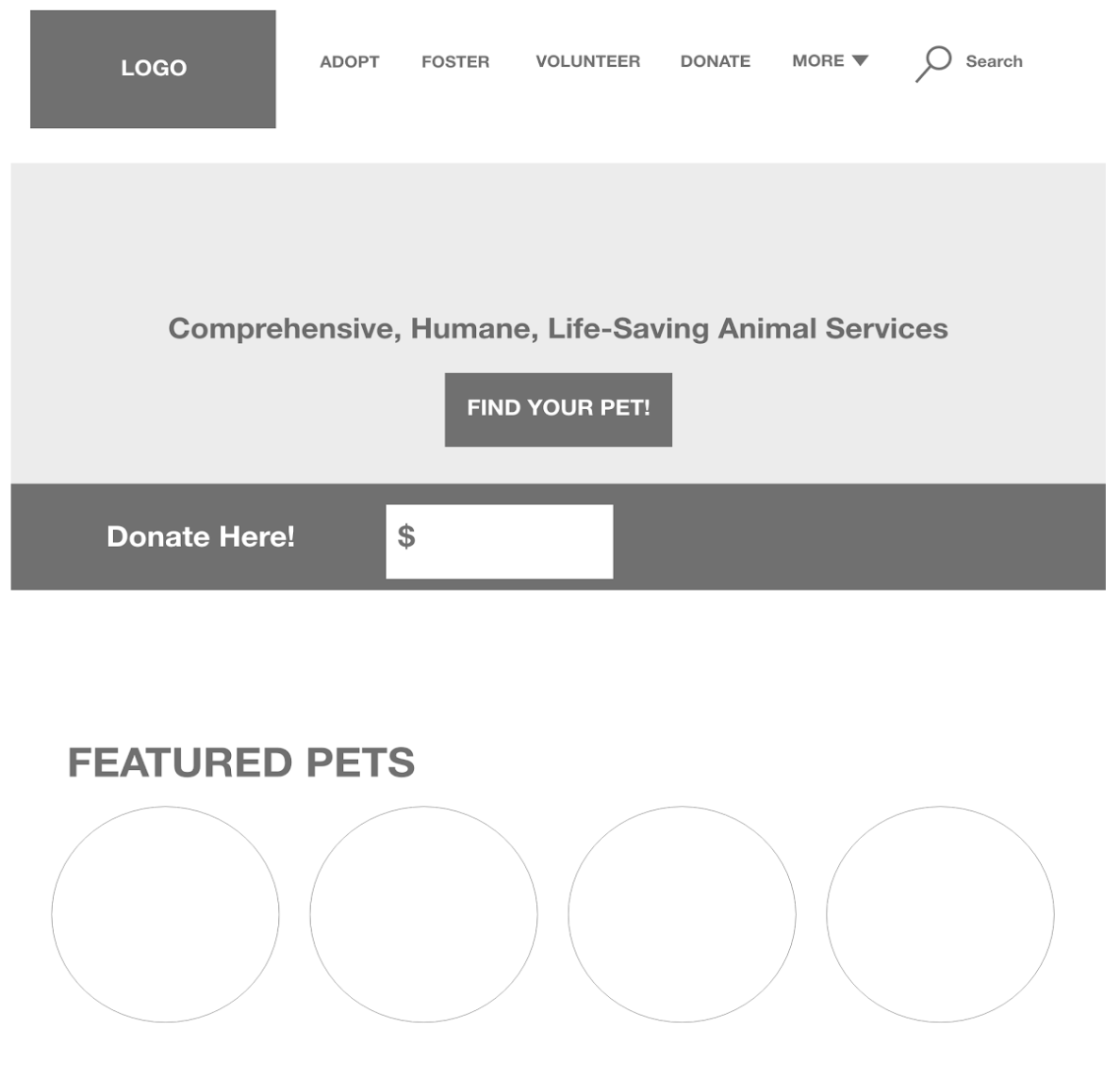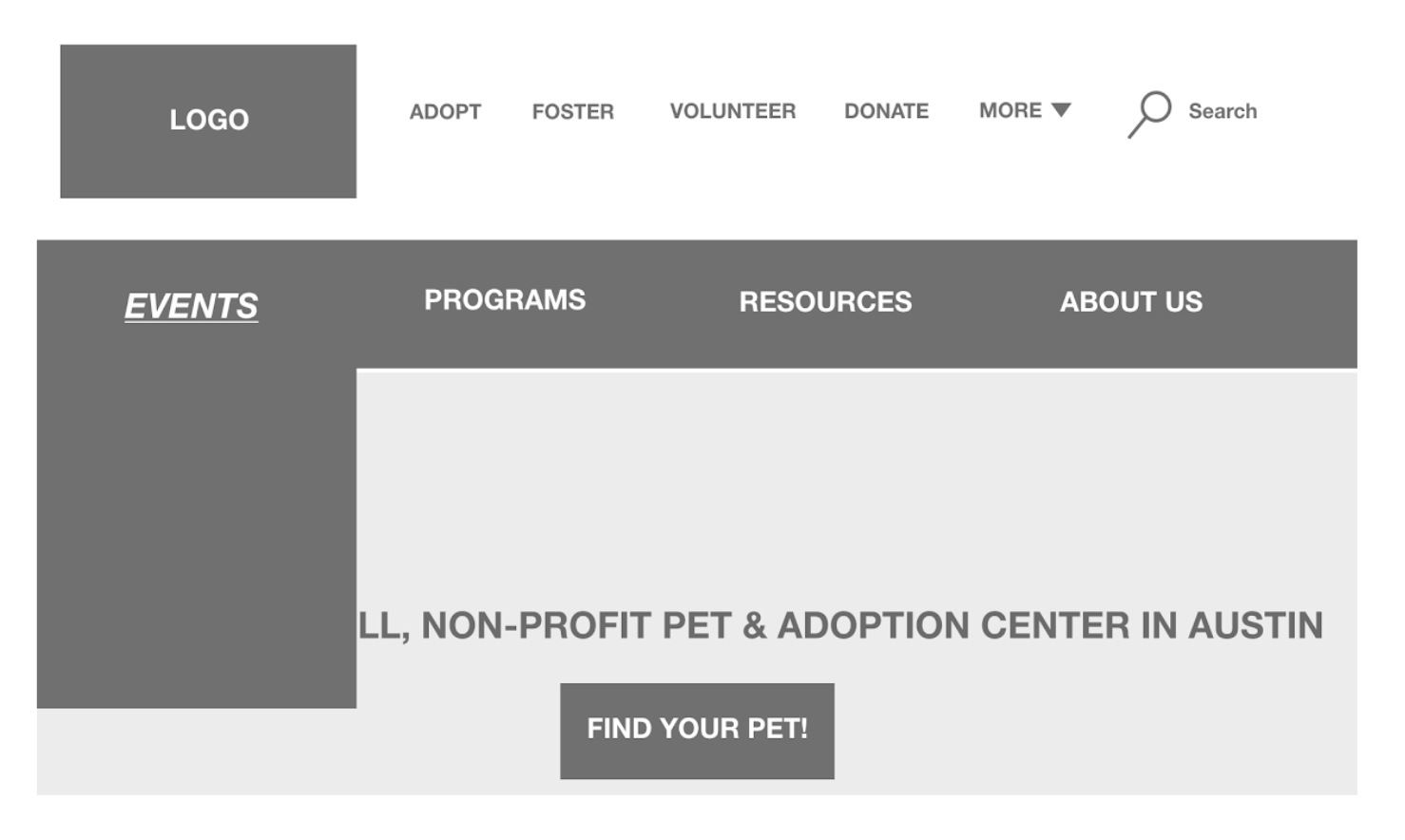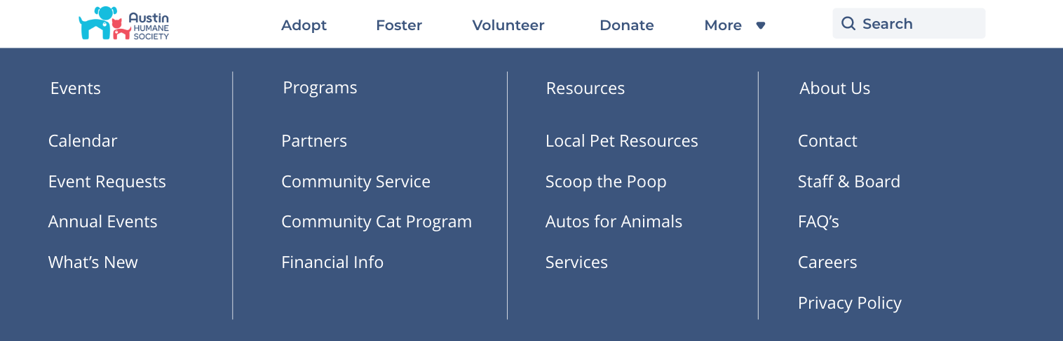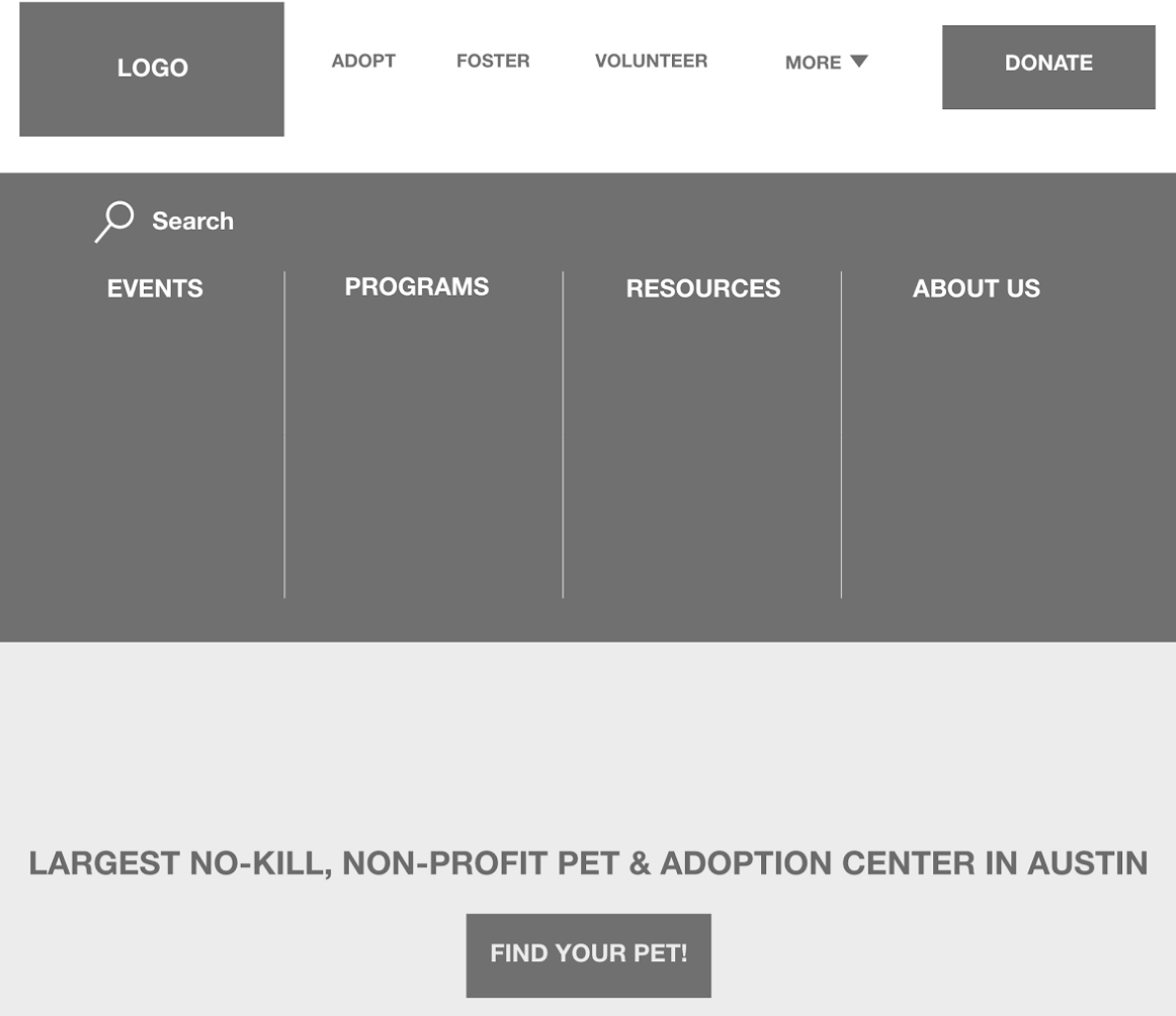 After usability testing we discovered that users expected and desired a search functionality in the navigation. It was also mentioned that, having adopt, foster and volunteer near the top of the home page, in the hero section, was repetitive.