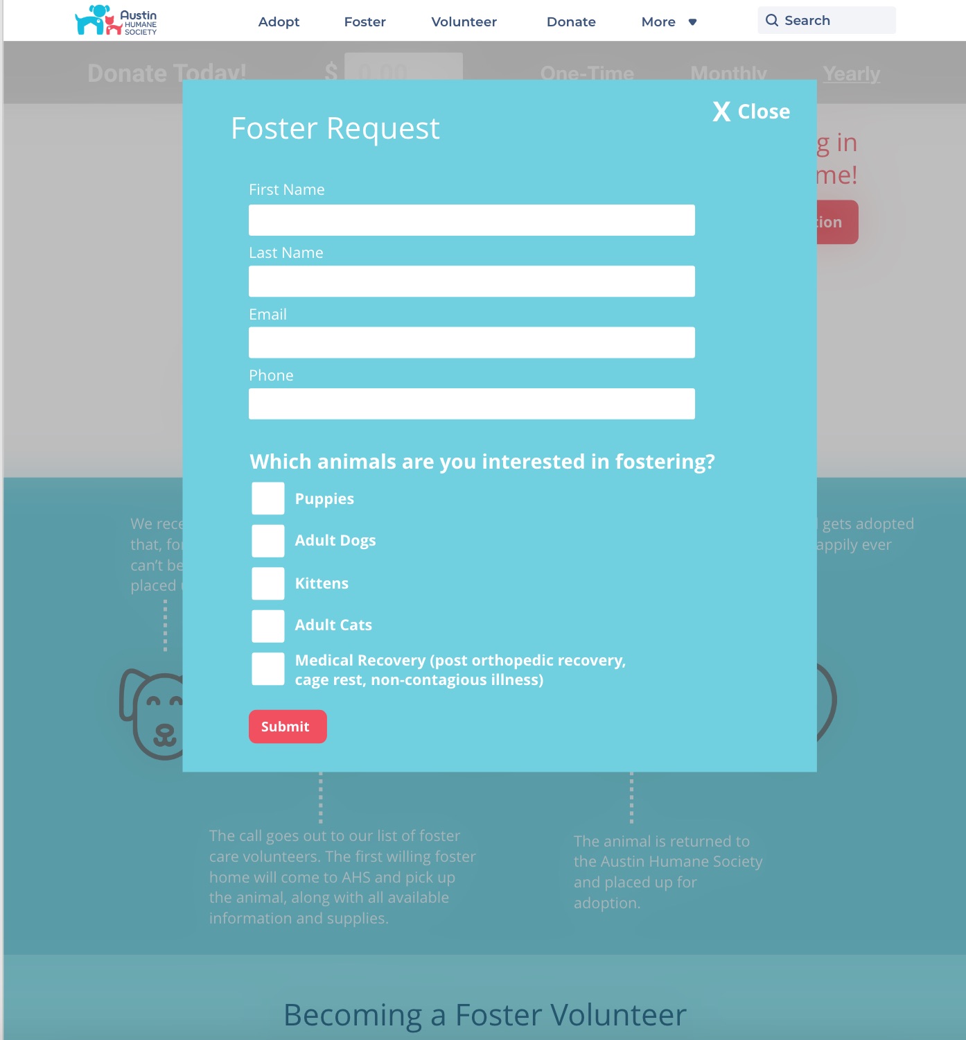 Turning the original lengthy form into this friendly pop up window when selected, was useful since we did not want to have users navigate away from the foster page. Thanks to the serious nature of taking on these animals into your home, we guide people to read the informative page describing the process involved with becoming a foster parent home for animals again.
