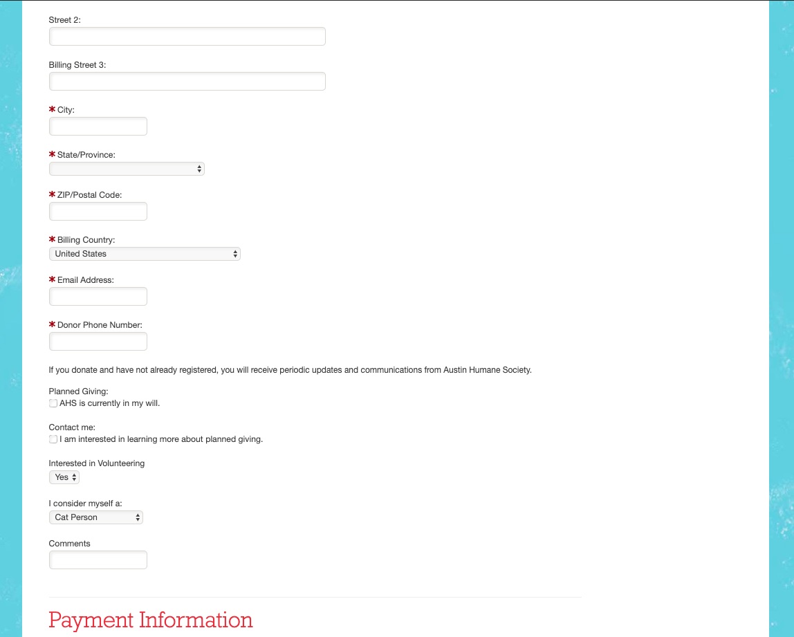 The colors needed to stand out from the competitors and exude the fun and playful tone that was already exemplified in Austin Humane Society's branding. In our initial research the majority of our testers commented about how much they loved the colors on the page already, a user said they were, "bright, playful and fun!"
