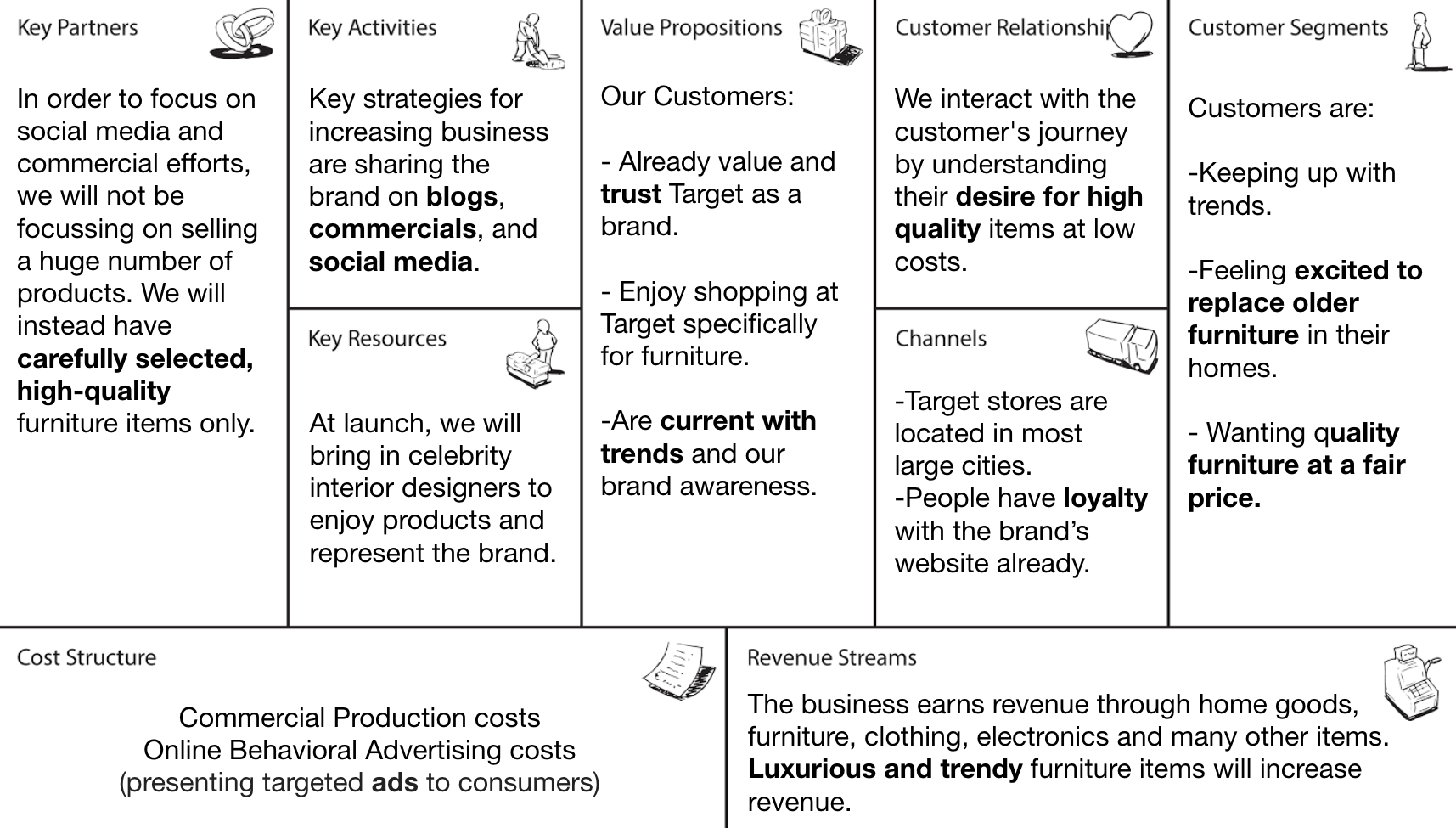 View Design Deck PDFI created this tool to help us quickly and easily define and communicate our business idea. The key takeaway from this tool is the value propositions I uncovered. Research showed how Target has a loyal customer base who enjoy trendy furniture in their homes.