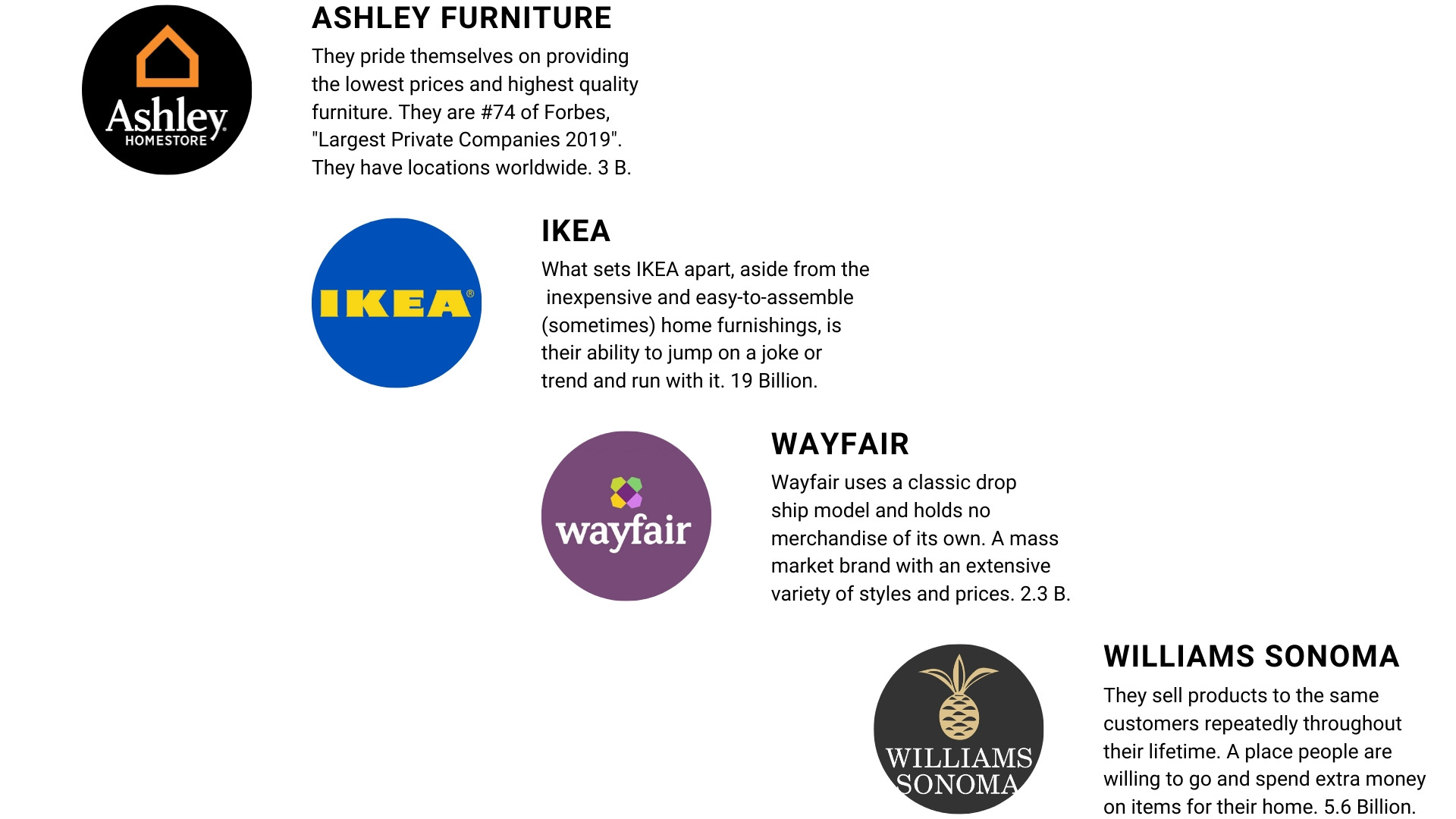 One question we asked: "Which of these retailers would you buy furniture from?" Our users could select up to three stores from our list, and we gave the option to add more stores that were not listed. Out of 560 responses to this question, those surveyed added more than 40 other furniture retailers! The survey helped guide what stores we were going to research for inspiration. I did the competitor analysis to compare checkout flows for ideas on how to design the checkout experience that customers would be most comfortable with.