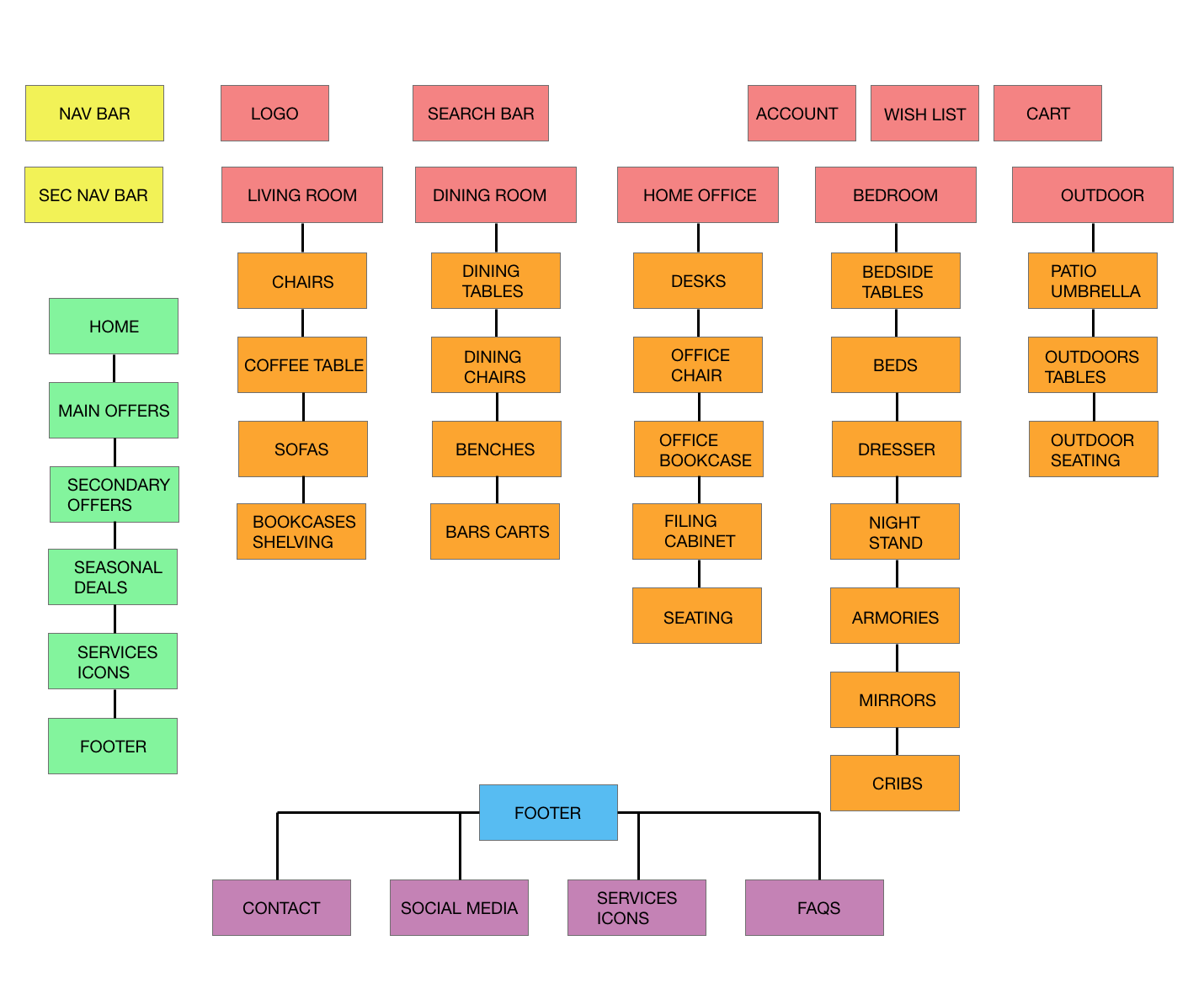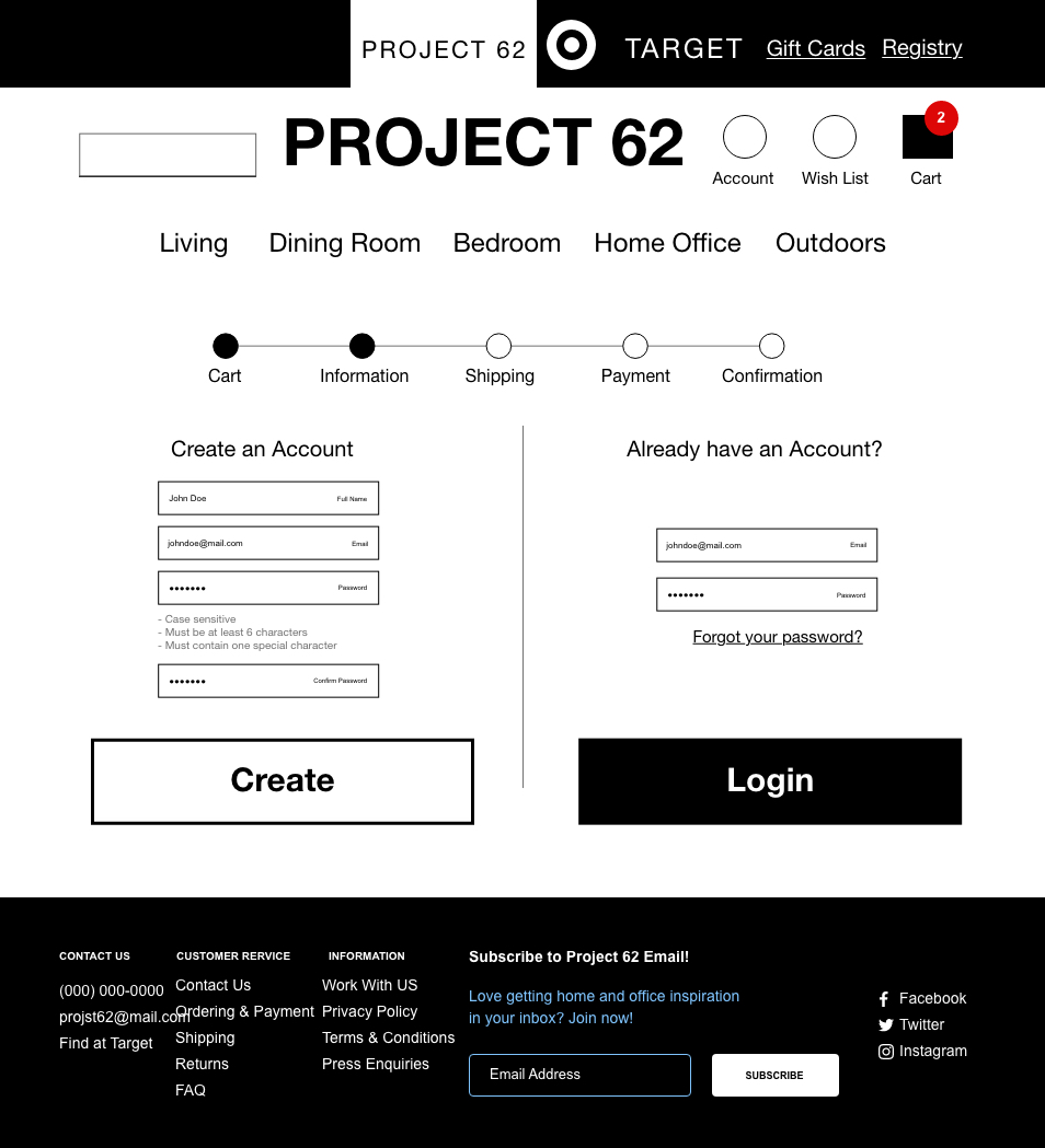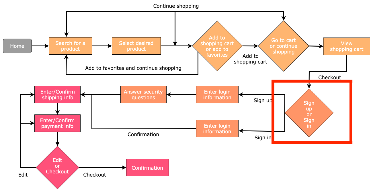 We imagined what the ideal user experience flow would look from the home page to check out. How could we make it easy for the shopper to navigate the website? During checkout the shopper was forced to register which is big reason shoppers abandon their carts. This frustrated people during testing since there was no " Guest checkout" to give them freedom to choose. We fixed this by removing the required registration field. This exercise helped us move forward with our information architecture.
